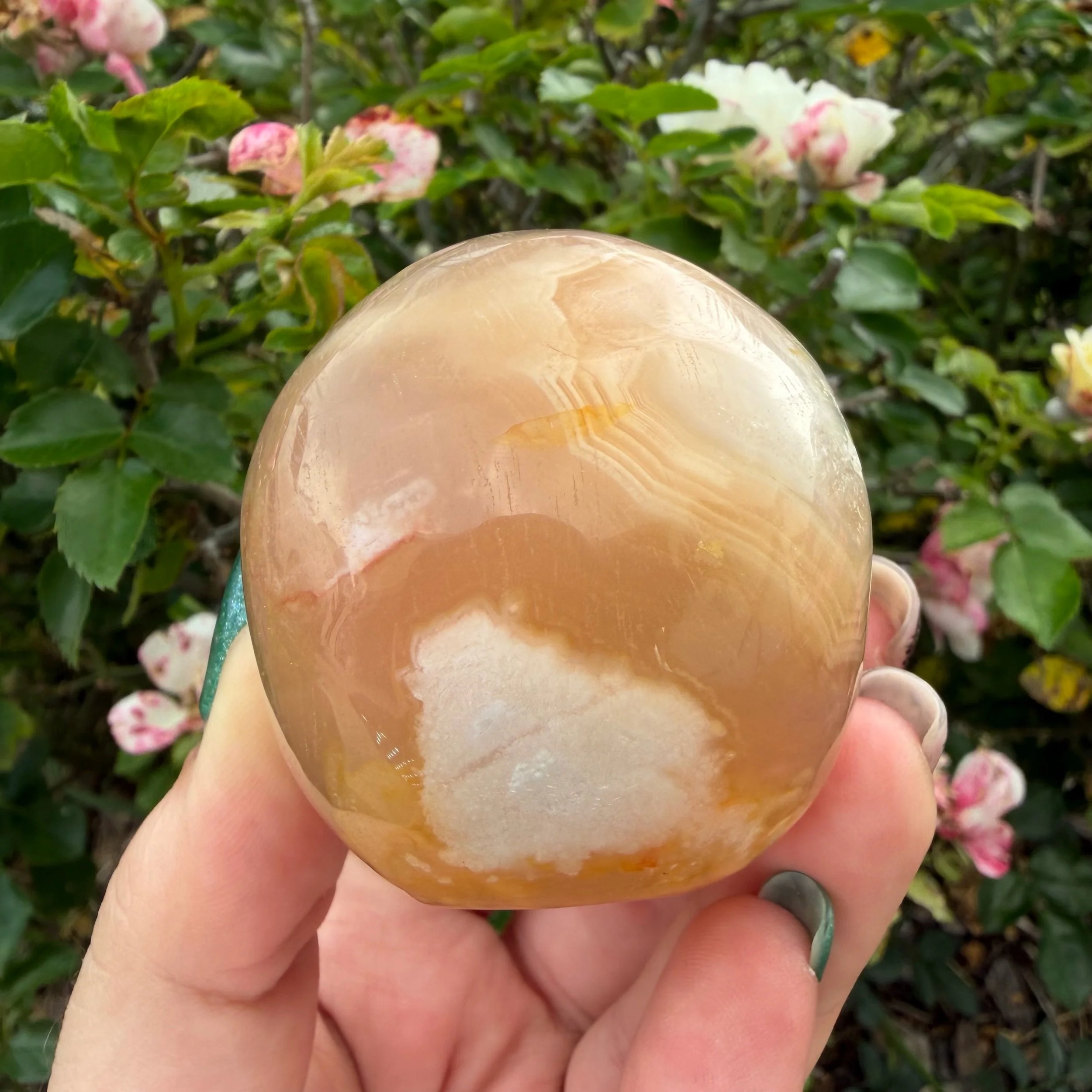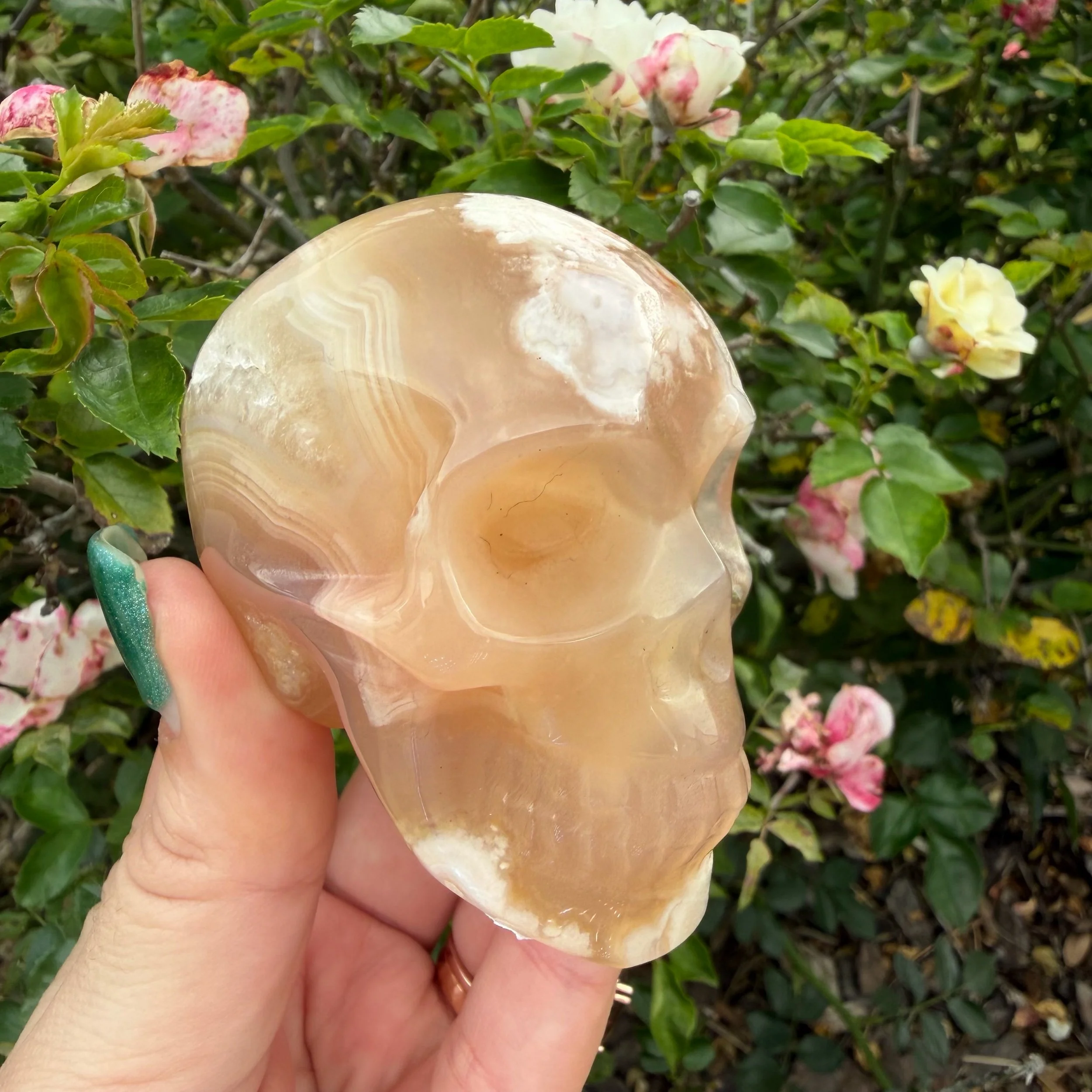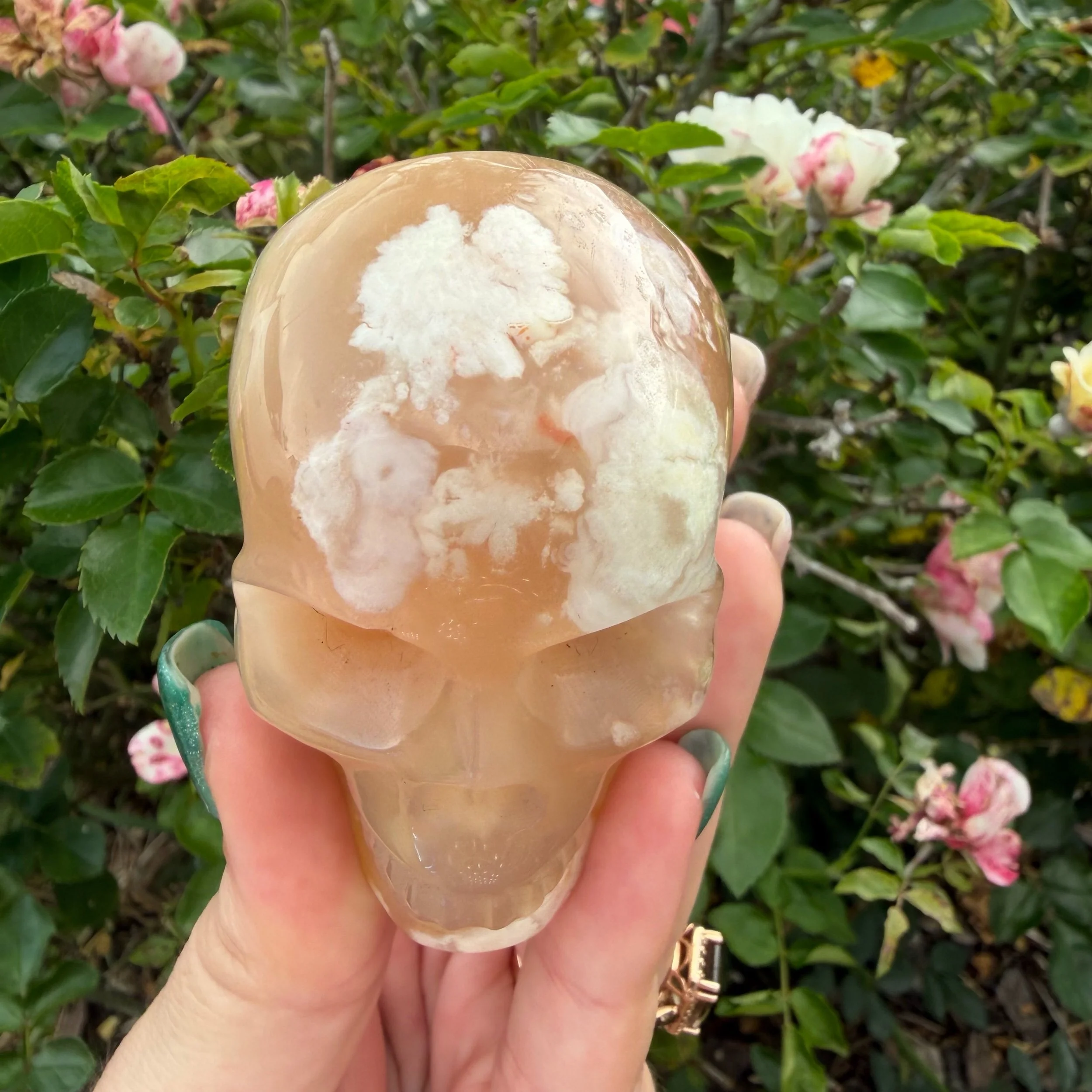 In metaphysical practice, the skull carving is highly revered as a vessel for wisdom and insight. Rather than being associated with the macabre, skulls are often used as tools for ancestor work, deep meditation, and accessing the Akashic records or inner knowledge. When paired with the nurturing vibrations of Flower Agate, this carving becomes a companion for anyone who needs to feel safe and supported while they navigate the sometimes-daunting process of personal transformation.
